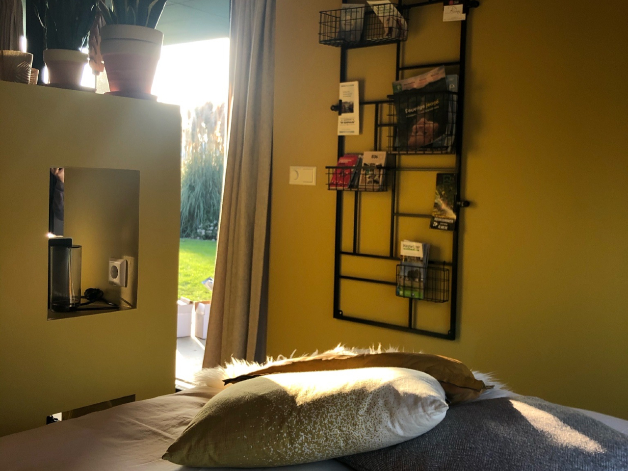 Deze lodge heeft een slaapgedeelte met een luxe 2- persoons boxspringbed met zacht linnengoed, tv met Netflix, gratis wifi, een eigen badkamer met regendouche, toilet en luxe badlinnen, Nespresso, waterkoker en een gezellige kleine lounge.